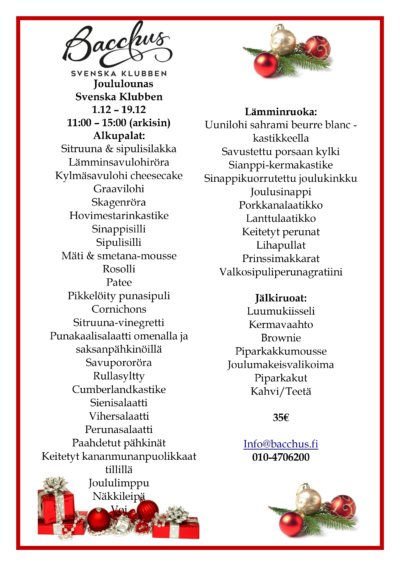 Marras- ja joulukuussa tarjoilemme herkullisen joulupöytämme Klubbenilla. Yksityishenkilöt voivat varata paikan perjantaisin ja lauantaisin klo 18.00–23.00 alkaen 21. marraskuuta. Joululounasta on tarjolla arkipäivisin lounasaikaan joulukuussa alkaen 1. joulukuuta.